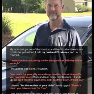 When my mom had a stroke, I asked my husband if I could borrow his car to visit her. His response shocked me: “Sure—$65 a day.” It…