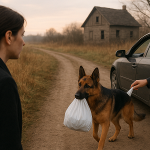 A woman observed a German Shepherd strolling along the street with a white bag in its jaws: abruptly, a car pulled up, and the driver swiftly retrieved the bag before speeding off.