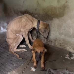 In a heart-wrenching scene of hardship, a mother dog rested, bound by chains and weakened, barely able to rise, while her small, fragile puppy stood faithfully by…